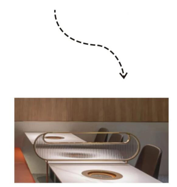 本案空間為長條形空間布局,Mo?意大利灰時尚水磨石的溫潤打底,在自然光和人工照明的配合下,具有的儀式感和藝術感。木色防火板提升空間溫度,牛角造型隔斷讓用餐變得精致有趣,不銹鋼配亞克力的架構則注入絲絲硬朗風,陣列的牛角磚更是空間和品牌文化的又一次呼應……